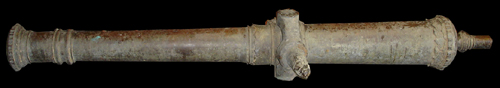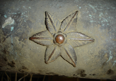 The front of the muzzle has a raised sight. On the First Reinforcing there’s a raised leaf-like design. This type of design is similar to other 16th and 18th century bronze Portuguese swivel type cannons therefore we are assuming this cannon is of Portuguese origin also. Muzzle, reinforcings, dolphins and solid cascable [without any hole] also give clues to the Portuguese origin of this beautiful bronze cannon.